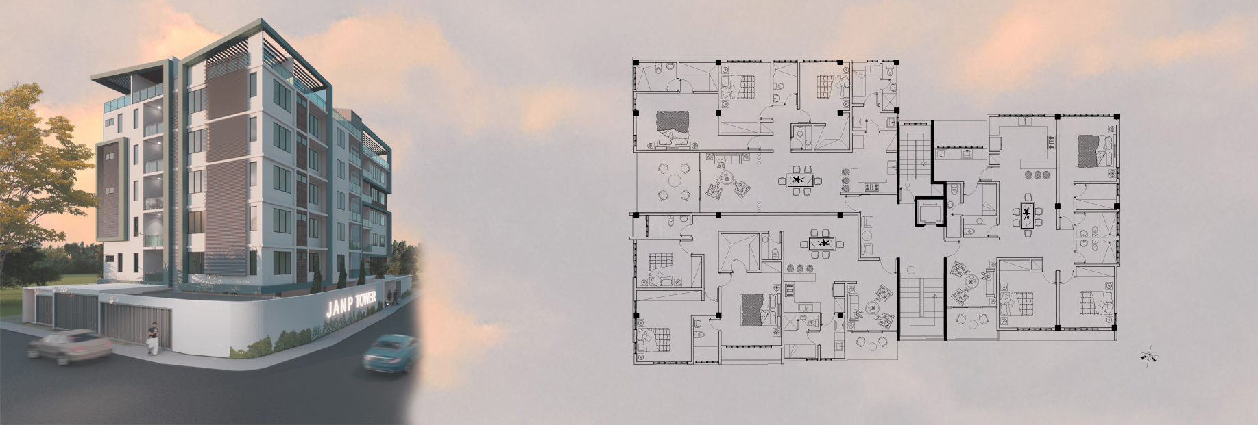 Janp Tower es un edificio multifamiliar diseñado para la Inmobiliaria Núñez Carrasco. Ubicado en una de las zonas más privilegiadas de la ciudad, el proyecto busca maximizar el uso del terreno y ofrecer apartamentos con todas las comodidades modernas a sus futuros propietarios.