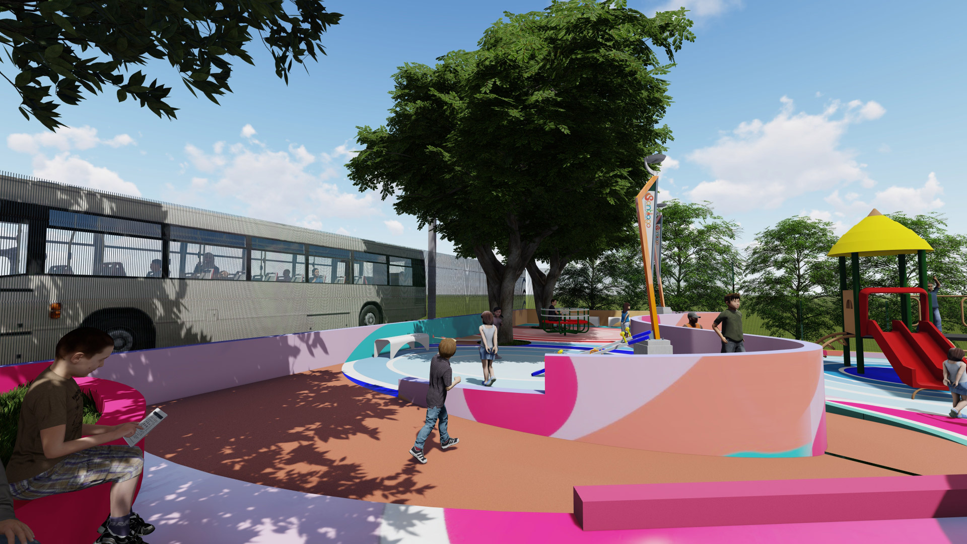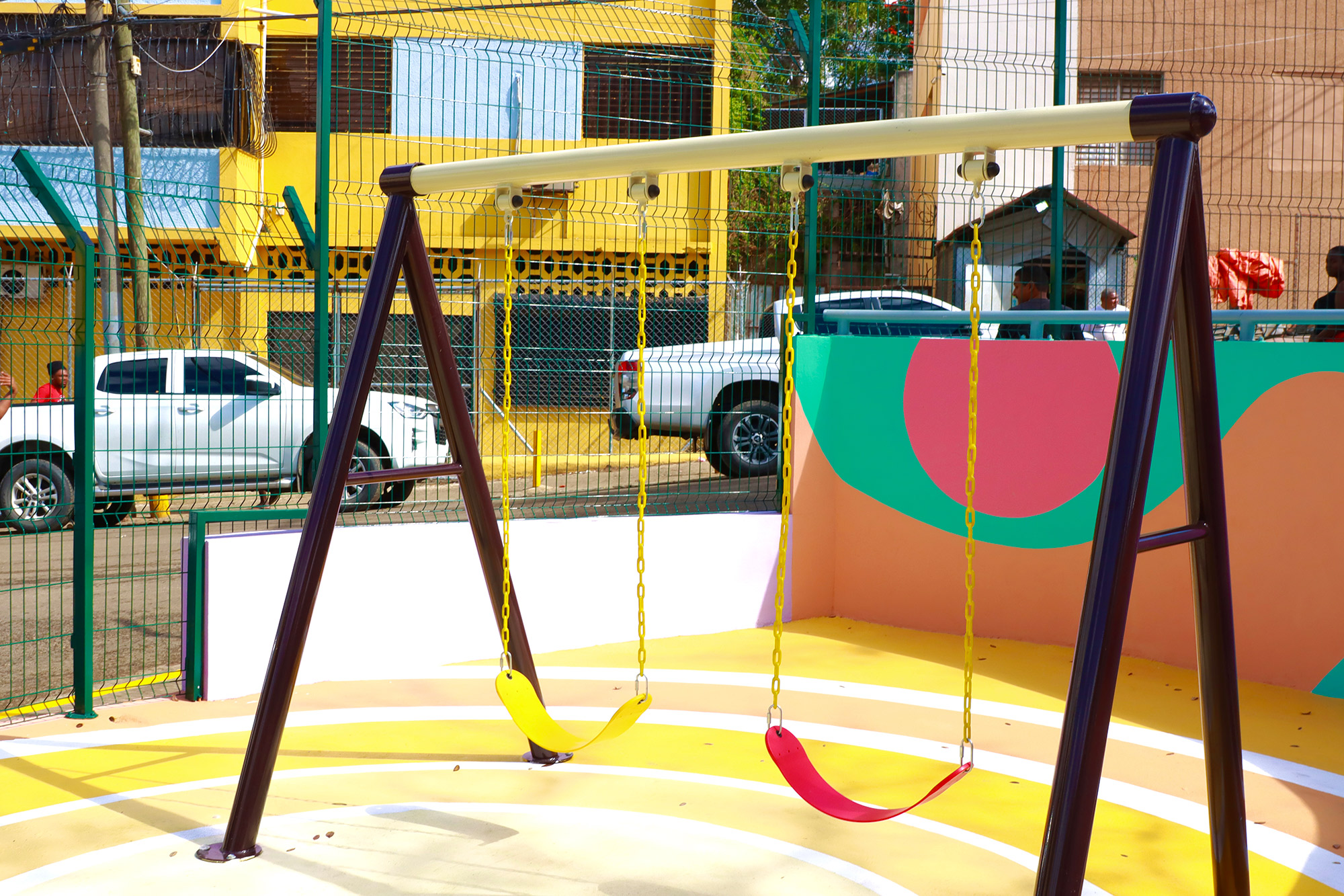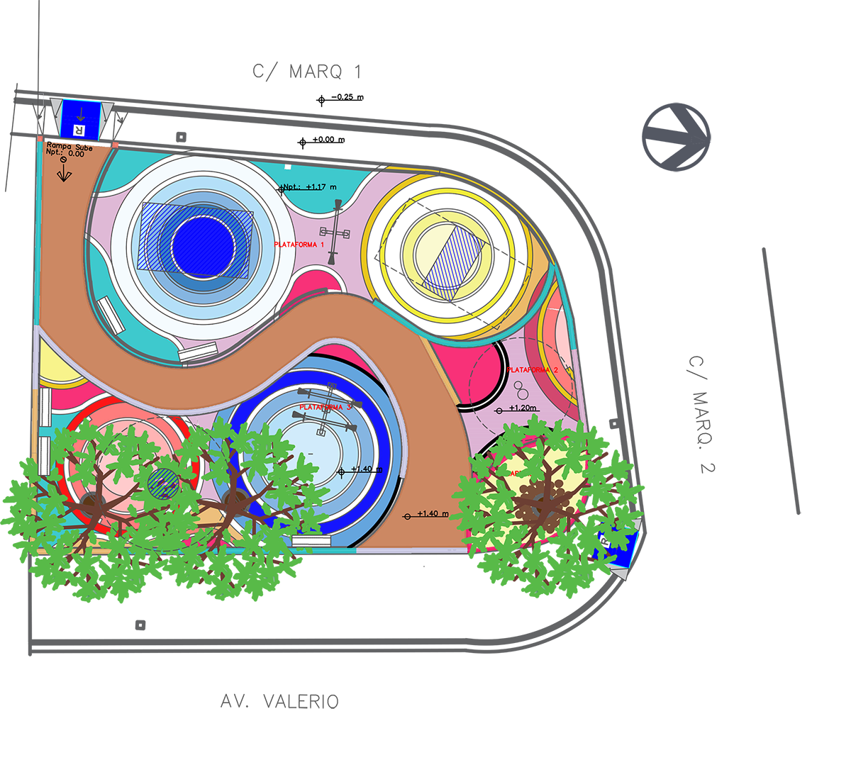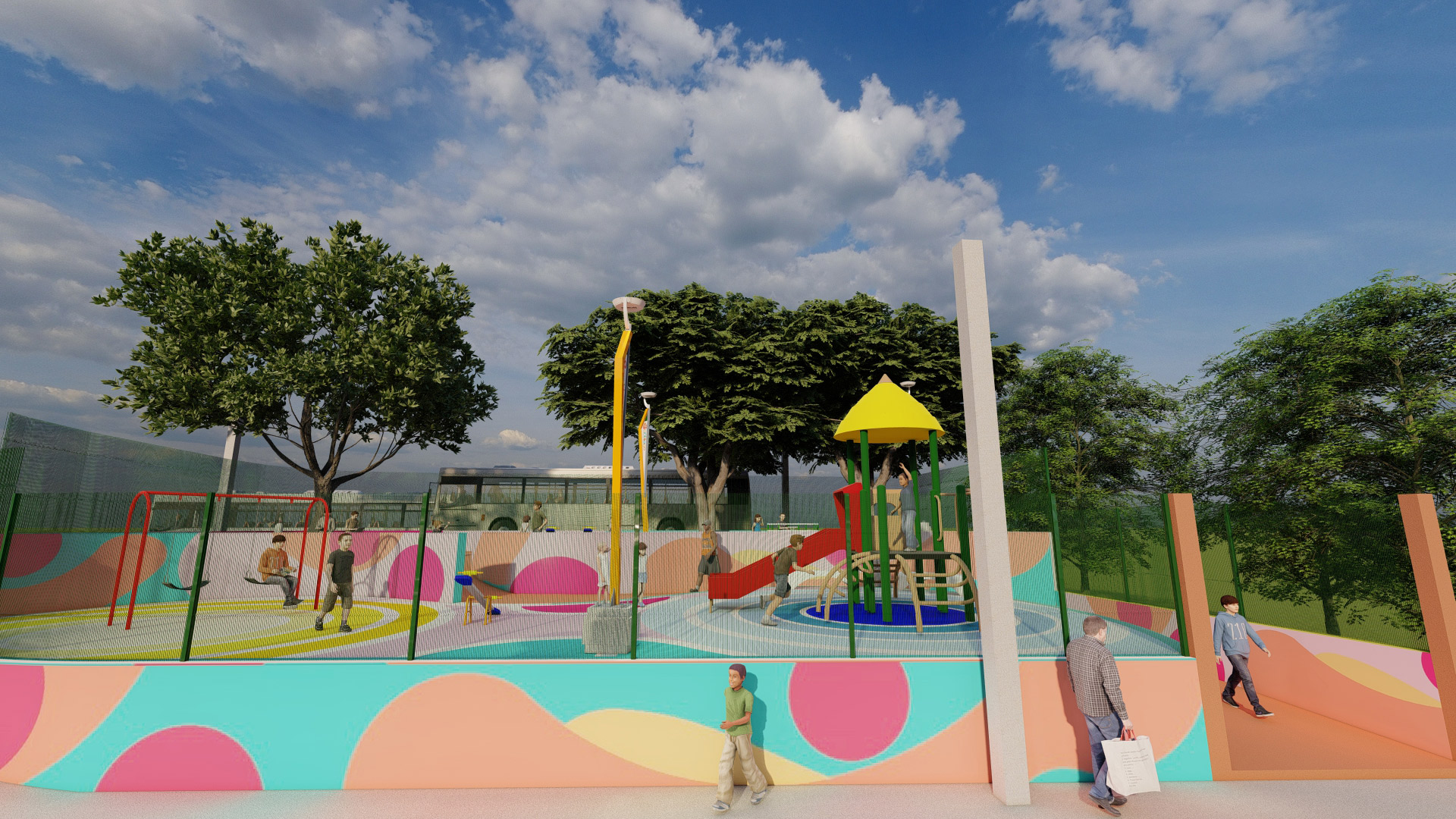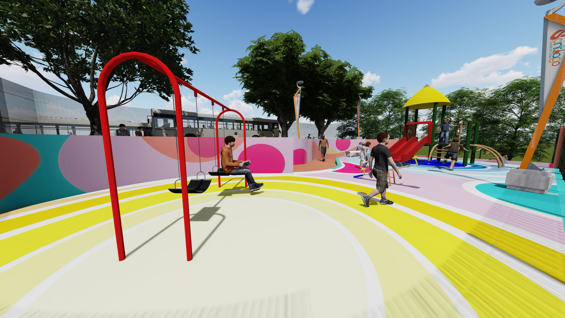 Uno de los desafíos de diseño fue el desnivel del terreno, que superaba los 2 metros. La solución concebida implicó la creación de una única vía de circulación, en forma de “S”, a modo de rampa, dividiendo el terreno en dos plataformas distintas, aprovechando así el desnivel natural del terreno. Además, estas plataformas fueron diseñadas considerando categorías específicas de juegos infantiles y rangos de edad, con el objetivo de ofrecer una experiencia óptima adaptada a cada grupo de usuarios.
