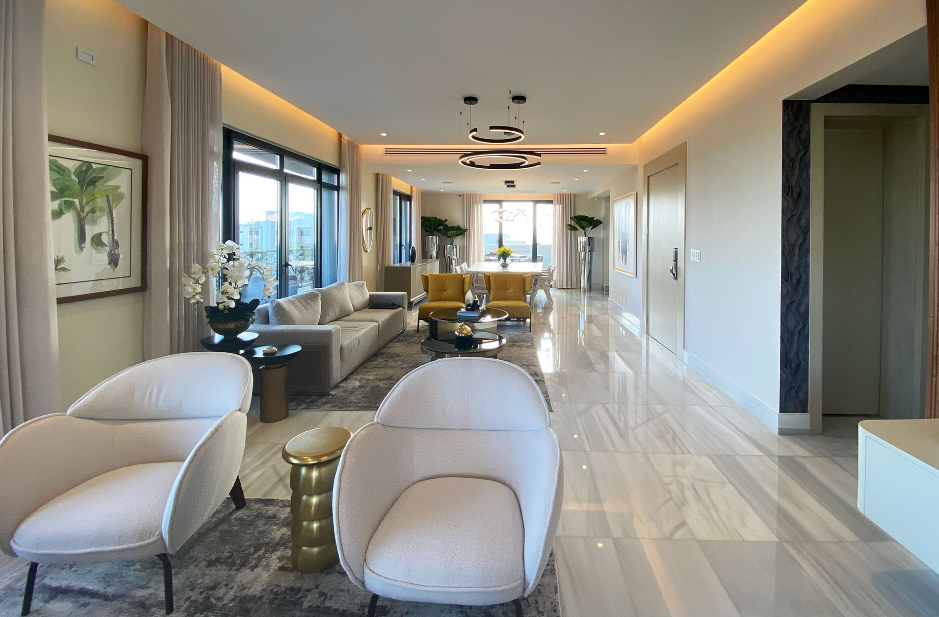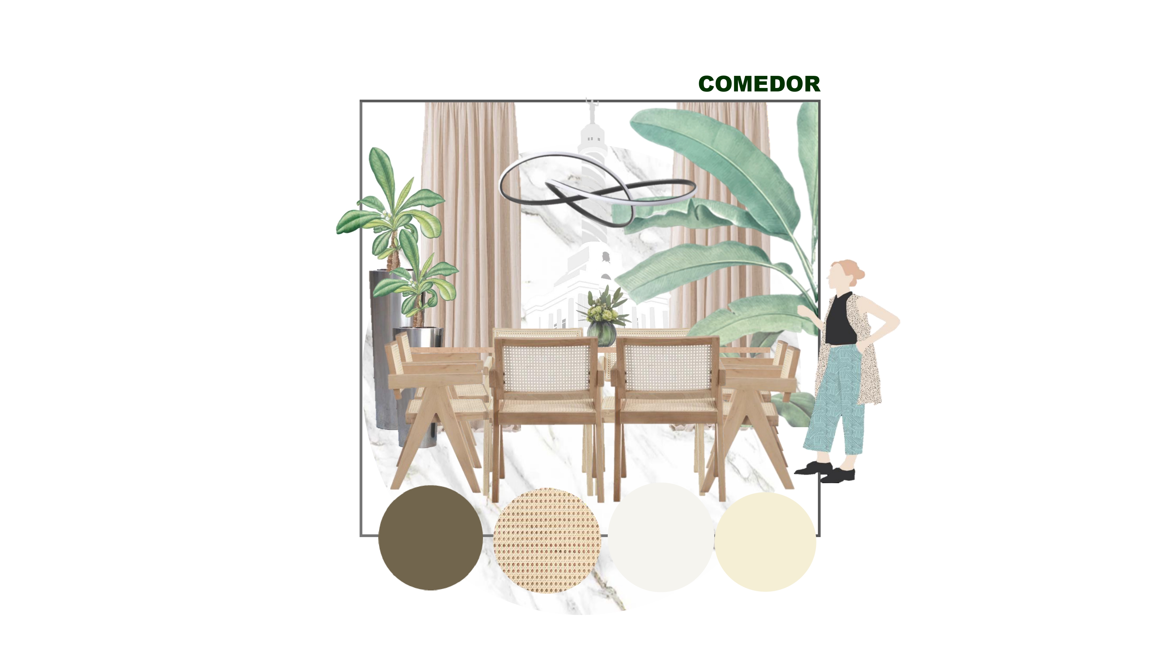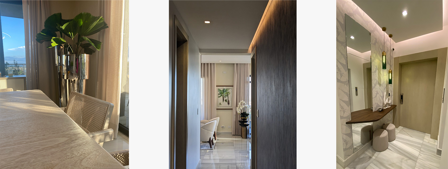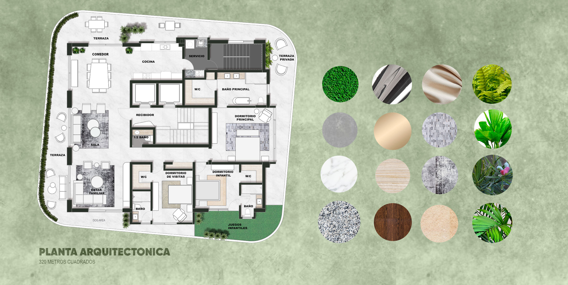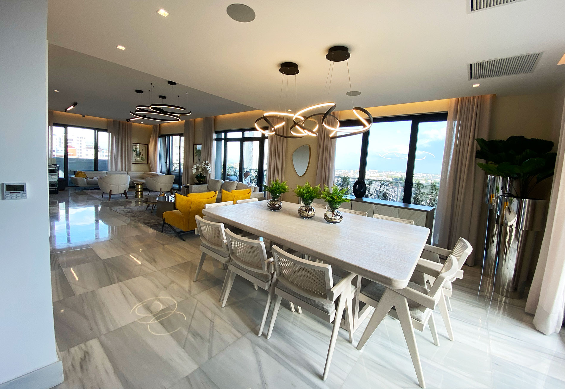 Se concibió un diseño en donde la naturaleza es la protagonista. Elementos naturales y orgánicos como la forma de los mobiliarios, accesorios y revestimientos enmarcados dentro de un marco de materiales con carácter neutrales crean una atmosfera con pretensiones de jardín. Totalmente orgánicas las extraordinarias visuales aportan un aire de libertad plena, confiriendo a el proyecto una interacción permanente con el exterior. Las impresionantes vistas de la ciudad son el elemento central del diseño, especialmente en las áreas sociales, creando un entorno que invita a la contemplación y al disfrute del paisaje urbano.La terraza perimetral se ha transformado en un oasis verde con podocarpos, Palmas Bambo y helechos. Estos elementos equilibran el gris de las paredes y el mármol del suelo, complementando el mobiliario de mimbre y textiles grises para crear un ambiente sereno y sofisticado.